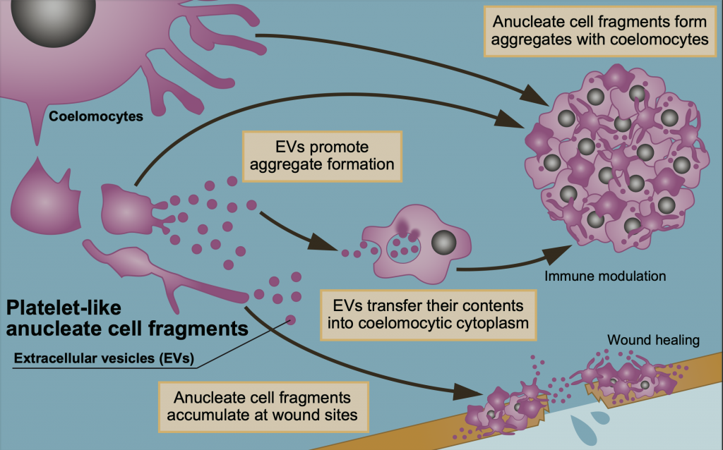 結果として、体液中に細胞外小胞が大量に含まれていることに気づき、その細胞外小胞を直接観察するために撮影した電子顕微鏡写真の中に、免疫細胞よりはるかに小さく細胞外小胞よりはるかに大きい、まるで血小板のように見える細胞断片を発見し、その血小板様の細胞断片が細胞外小胞の主要な供給源として機能しているという、今回の論文のストーリーが出来上がっていったのでした。